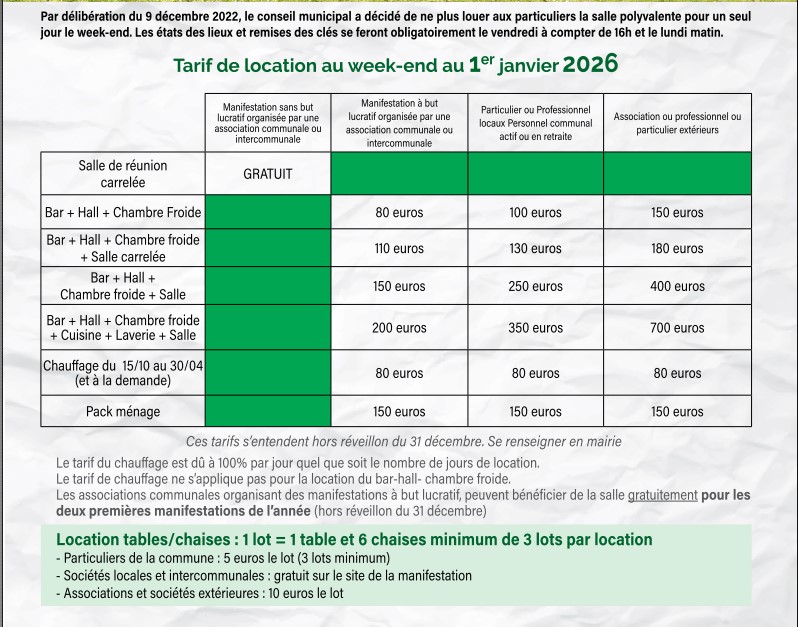Le tarif applicable de location, faisant l’objet d’une révision annuelle par le Conseil Municipal, sera celui en vigueur le jour de la location. La facture sera à régler au Service de Gestion Comptable de Bourg-en-Bresse dès réception.